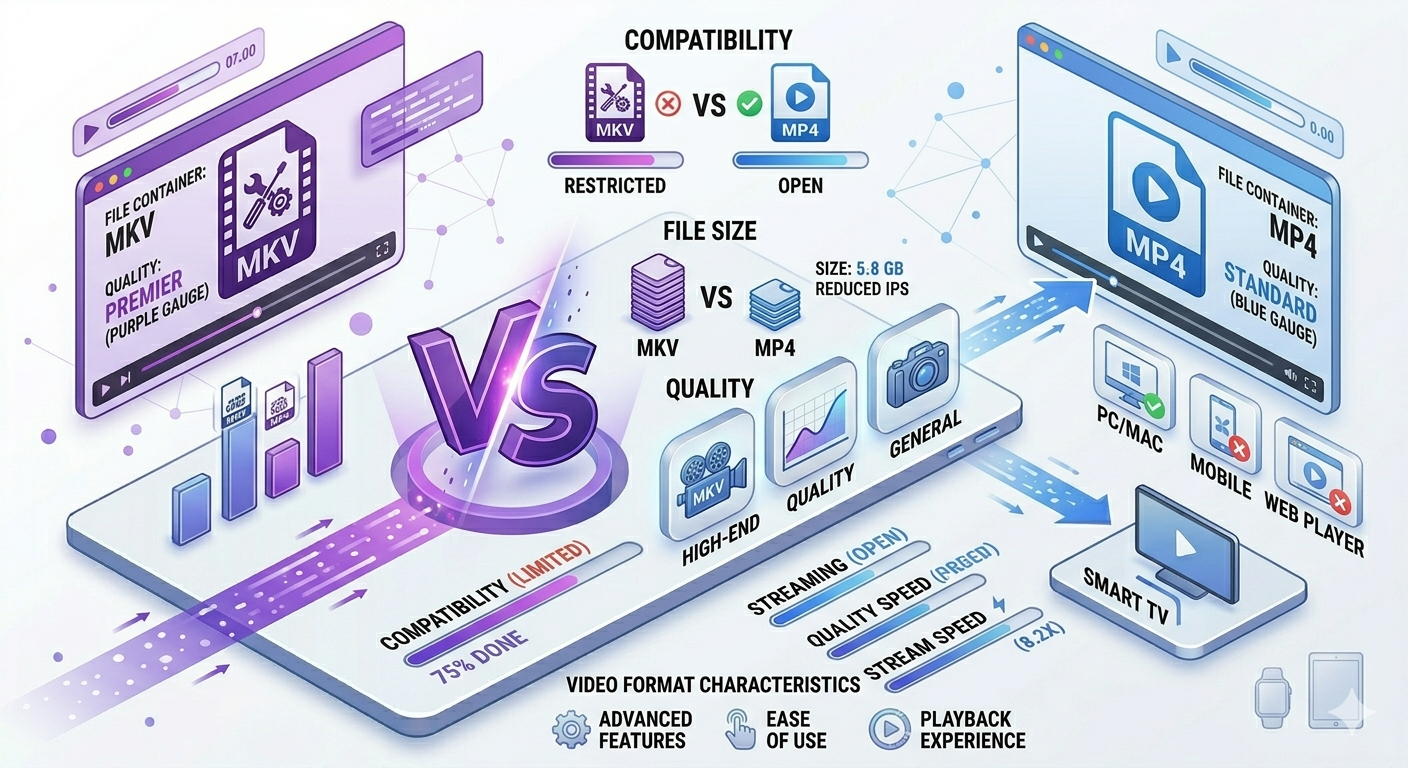 Choosing between MKV and MP4 can be confusing. Both are container formats that hold video, audio, and subtitles, but they serve different purposes. MP4 offers universal compatibility and streaming optimization. MKV provides flexibility and quality preservation. Here's exactly which format to use for your needs.