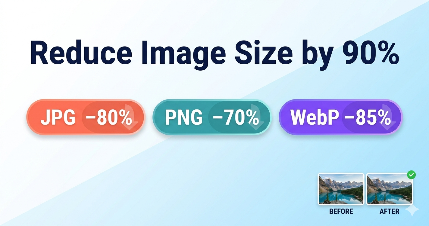 Use Free Media Tools' image compressor to reduce image file size by 60-80% instantly. Our tool uses advanced compression algorithms to maintain visual quality while dramatically reducing file size. Works with JPG, PNG, WebP, and other formats.