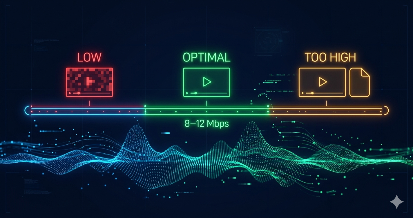 Bitrate is the amount of data processed per second in a video, measured in Mbps (megabits per second). Higher bitrate = better quality but larger files. For 1080p video, use 8-12 Mbps for web/YouTube, 5-8 Mbps for streaming, and 35-45 Mbps for 4K. Use our video compressor to optimize bitrate automatically.