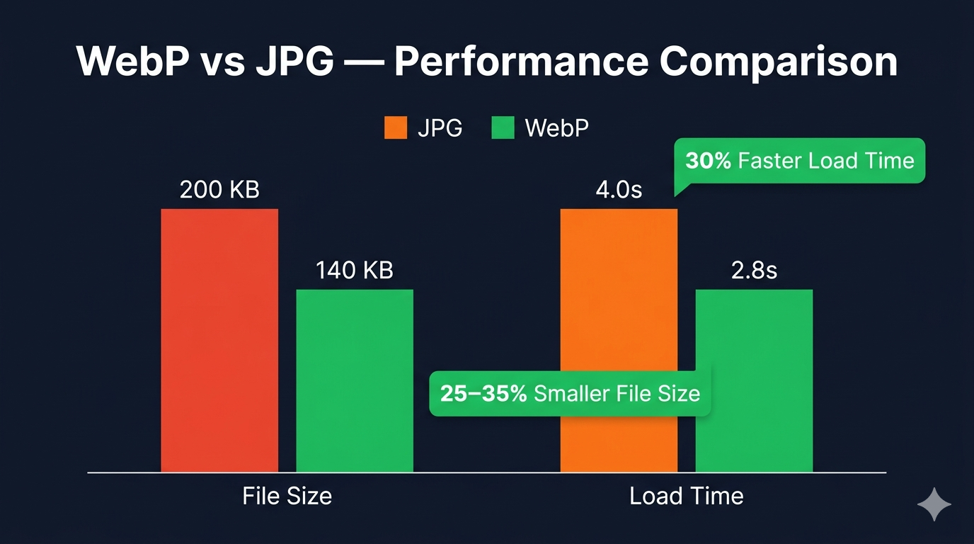 - File Size Comparison: Visual showing same image in JPG and WebP with file sizes (Alt text: "Side-by-side comparison of identical image in JPG format (200KB) and WebP format (140KB)")
